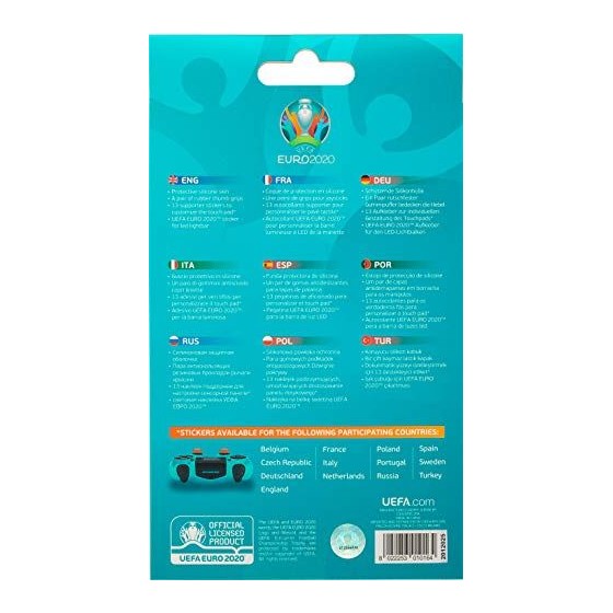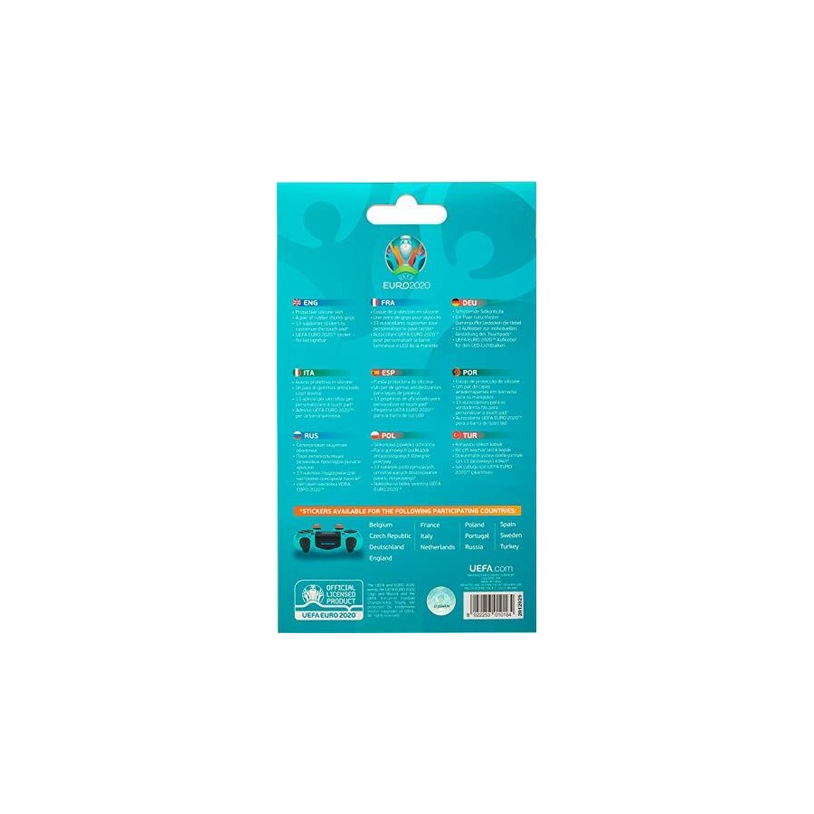 Ένα προστατευτικό σιλικόνης για το χειριστήριο PS4 (πωλείται χωριστά). ένα ζευγάρι αντιολισθητικά καλύμματα από καουτσούκ. Ένα αυτοκόλλητο UEFA Euro 2020 για τη ράβδο φωτισμού και δώδεκα αυτοκόλλητα για πραγματικούς οπαδούς για να προσαρμόσουν την επιφάνεια αφής, διαθέσιμα για τις ακόλουθες συμμετέχουσες χώρες: Βέλγιο, Γαλλία, Γερμανία, Αγγλία, Ιταλία, Ολλανδία, Πολωνία, Πορτογαλία, Ρωσία, Ισπανία, Σουηδία και Τουρκία.