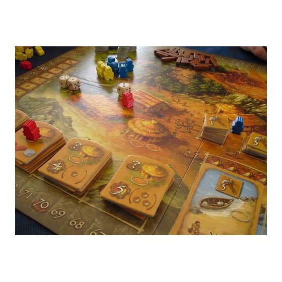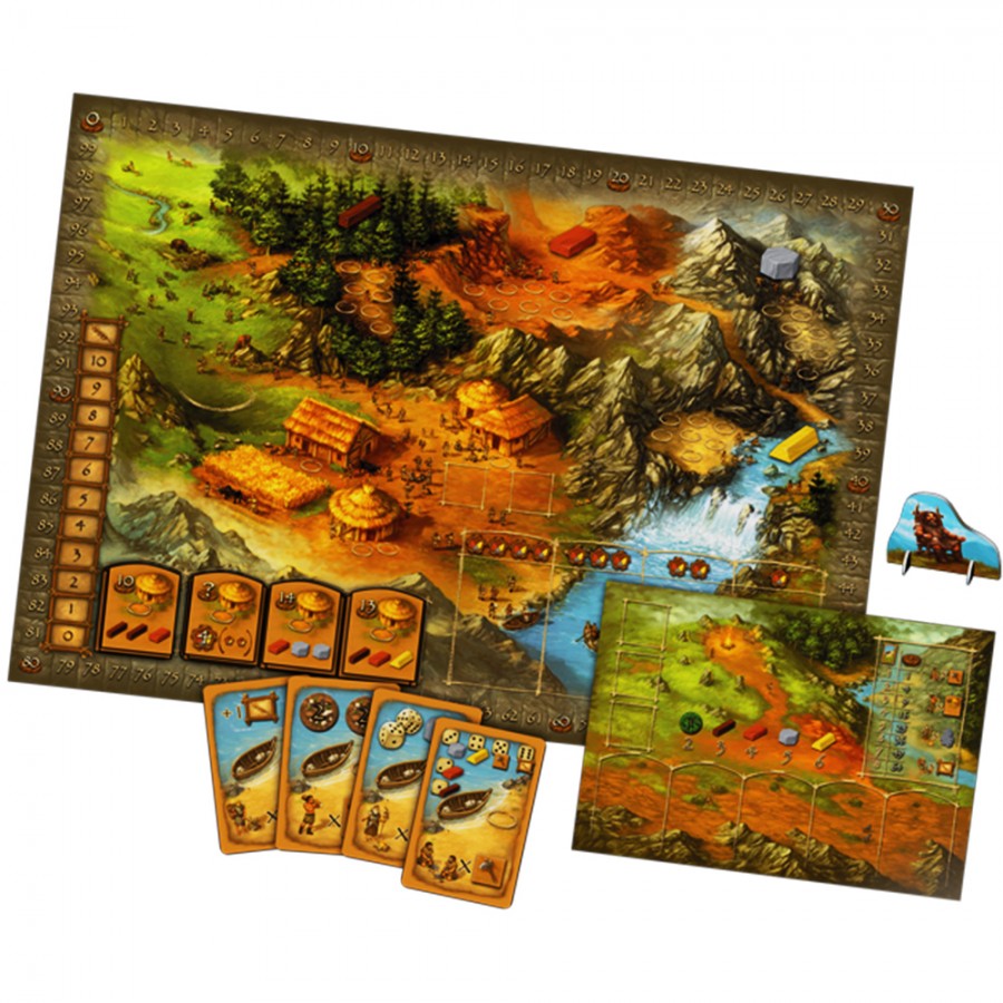 Περιεχόμενα: 116 ξύλινες φιγούρες, 116 πλακίδια, 36 κάρτες, 7 ζάρια, 4 πίνακες, 1 δερμάτινη κούπα ζαριών, 1 ταμπλό, κανόνες