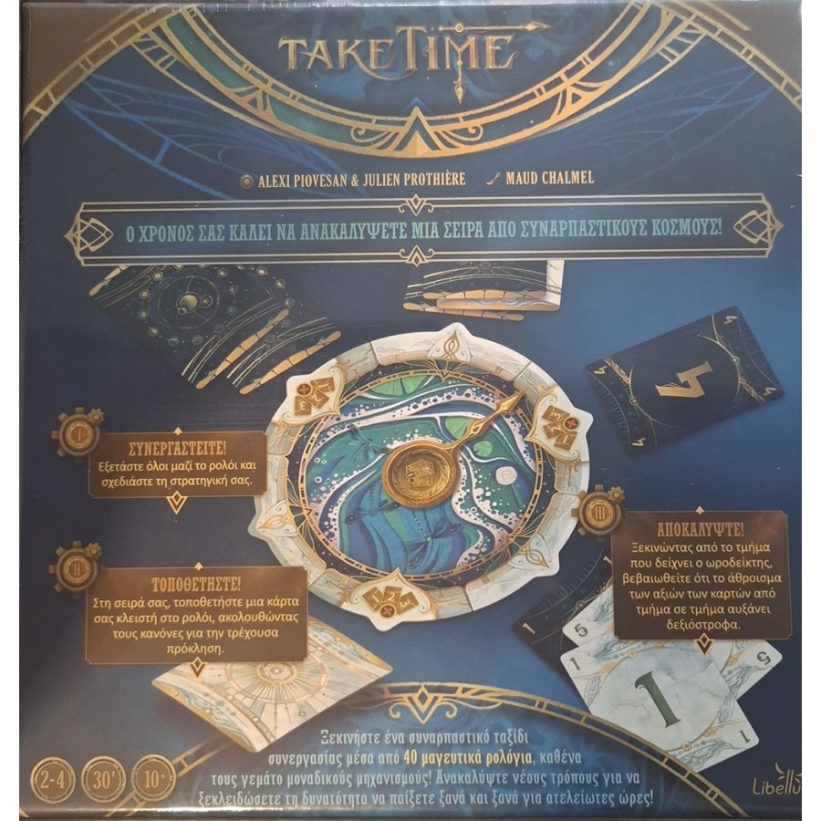 Το Take Time είναι ένα συνεργατικό παιχνίδι όπου οι παίκτες προσπαθούν να περάσουν διάφορα τεστ, και νικάνε ή χάνουν ως ομάδα. Για να τα καταφέρετε, πρέπει να τοποθετήσετε στρατηγικά 12 κλειστές κάρτες γύρω από ένα ρολόι, ακολουθώντας τους ειδικούς κανόνες που έχει το κάθε τεστ.