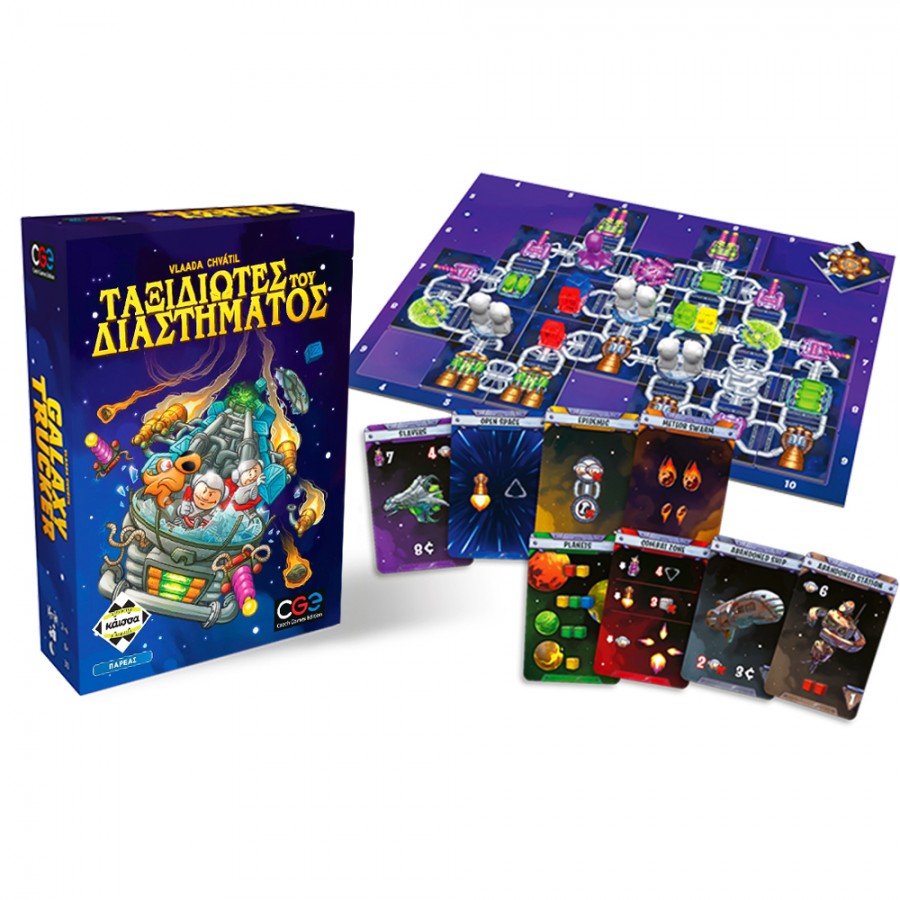 Περιεχόμενα: 2 ταμπλό πτήσης διπλής όψεως, 4 ταμπλό διαστημοπλοίων διπλής όψεως, 156 εξαρτήματα διαστημοπλοίων, 68 πλακίδια κοσμικών νομισμάτων, 6 πλακίδια τίτλων ταξιδιωτών, 60 κάρτες περιπέτειας, 42 φιγούρες αστροναυτών, 4 φιγούρες καφέ εξωγήινων, 4 φιγούρες μοβ εξωγήινων, 8 δείκτες ρουκετών σε 4 χρώματα, 40 δείκτες μπαταρίας, 55 κύβοι εμπορευμάτων, 2 ζάρια, 1 κλεψύδρα, 1 βιβλίο κανόνων, 1 πίνακας αναφοράς