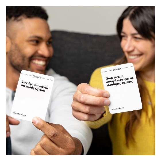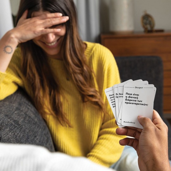 Φανταστείτε μια βραδιά όπου οι αναστολές υποχωρούν και η ειλικρίνεια παίρνει τη σκυτάλη. Με το Let's Get Deep, έχετε την ευκαιρία να ρωτήσετε όλα όσα διστάζατε μέχρι τώρα. Θέλετε να μάθετε τι σκέφτεται πραγματικά το άτομο που σας ενδιαφέρει ή να ανακαλύψετε άγνωστες πτυχές των φίλων σας; Το παιχνίδι σάς καθοδηγεί μέσα από τρία επίπεδα οικειότητας, ξεκινώντας χαλαρά και καταλήγοντας σε αποκαλύψεις που θα συζητιούνται για καιρό. Είναι η ιδανική ευκαιρία για να σπάσετε τον πάγο, να γελάσετε με την ψυχή σας και να συνδεθείτε σε ένα πιο ουσιαστικό επίπεδο, μετατρέποντας μια απλή συνάντηση σε ένα συναρπαστικό ταξίδι αυτογνωσίας.