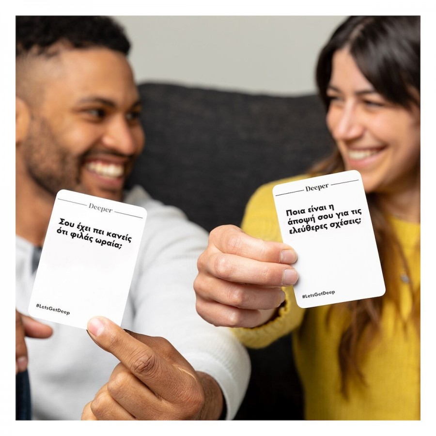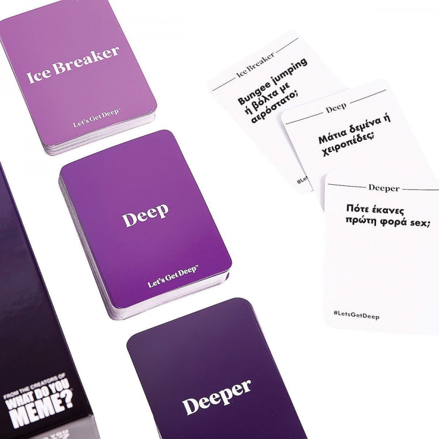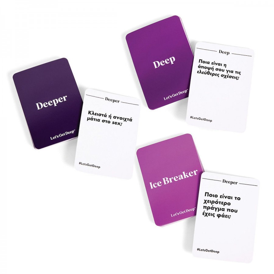 Το Let's Get Deep της AS Games είναι το απόλυτο επιτραπέζιο παιχνίδι ενηλίκων, σχεδιασμένο για ζευγάρια και παρέες που επιθυμούν να περάσουν τον χρόνο τους ουσιαστικά και διασκεδαστικά. Απευθύνεται σε άτομα ηλικίας 18 ετών και άνω και προσφέρει την τέλεια αφορμή για να ξεκινήσουν συζητήσεις που ξεφεύγουν από τα συνηθισμένα. Είτε πρόκειται για τον σύντροφό σας είτε για την παρέα σας, αυτό το παιχνίδι εγγυάται ότι θα μάθετε πράγματα που δεν φανταζόσασταν, μέσα από μια σειρά ερωτήσεων που ποικίλλουν από αστείες έως βαθιά προσωπικές.