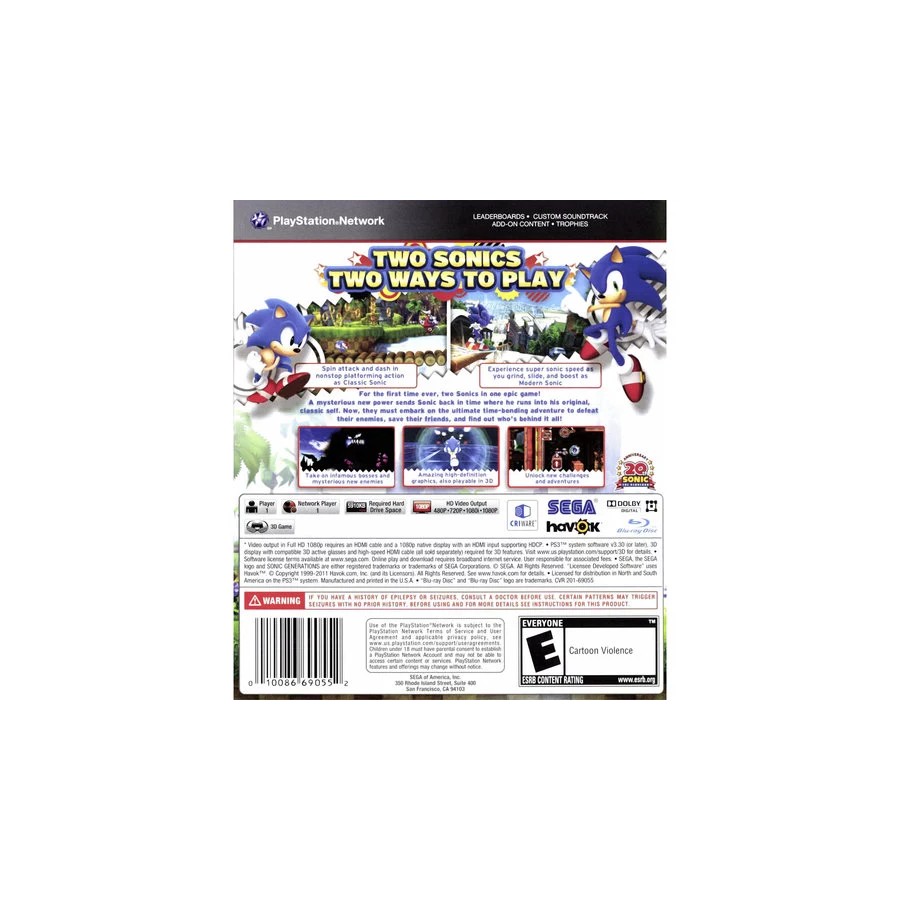 Η ιστορία του PS3 Game Sonic Generations ξεκινά με ένα πάρτυ-έκπληξη που ετοιμάζουν ο Tails και οι φίλοι του σκαντζόχοιρου προς τιμήν των γενεθλίων του. Πριν αρχίσει όμως για τα καλά το γλέντι, ένα μυστηριώδες oν εισβάλλει και χαλάει τα σχέδια της παρέας, στέλνοντας τον Sonic σε μία περιπέτεια, καθ’ όλη τη διάρκειά της οποίας θα πρέπει να συμμαχήσει με τον “παλιό του εαυτό”, να ξαναζήσει τις αναμνήσεις του και να νικήσει άλλη μια φορά τον Dr.Eggman