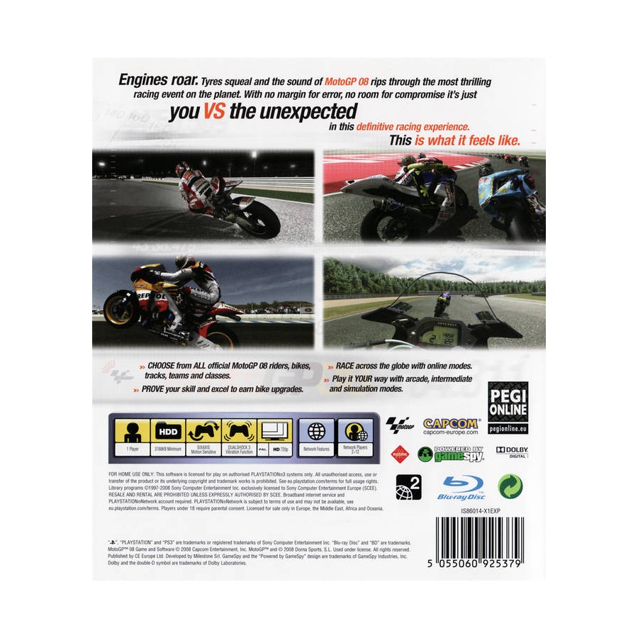 Ζήστε την ένταση και το πάθος του Moto GP μέσα από το επίσημο videogame Moto GP 2008. Όλοι οι αναβάτες, οι μοτοσικλέτες, οι ομάδες και φυσικά οι πίστες βρίσκονται εδώ έτσι ώστε να έχετε την πιο ολοκληρωμένη εμπειρία που μπορεί να προσφέρει το Moto GP 08. Αγωνιστείτε σε ένα ολόκληρο πρωτάθλημα, δημιουργήστε το δικό σας ή επιλέξτε έναν απλό αγώνα μόνος σας ή με κάποιον φίλο σας.