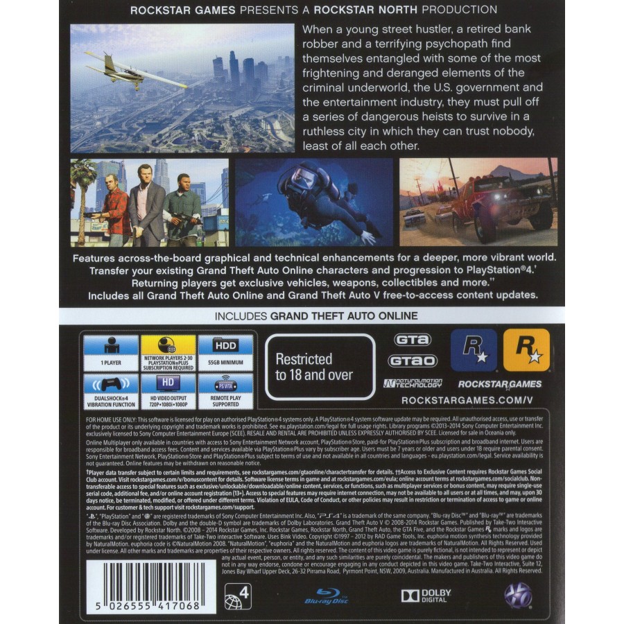 Το Grand Theft Auto V συνοδεύεται από το Grand Theft Auto Online, τον δυναμικό, συνεχώς εξελισσόμενο κόσμο που πλέον υποστηρίζει έως 30 παίκτες στο online παιχνίδι για PlayStation®4 και Xbox One. Όλες οι υπάρχουσες αναβαθμίσεις παιχνιδιού καθώς και το περιεχόμενο που έχει δοθεί από τη Rockstar για το Grand Theft Auto Online από την ημέρα κυκλοφορίας του, θα είναι διαθέσιμο για PlayStation®4, Xbox One και PC.