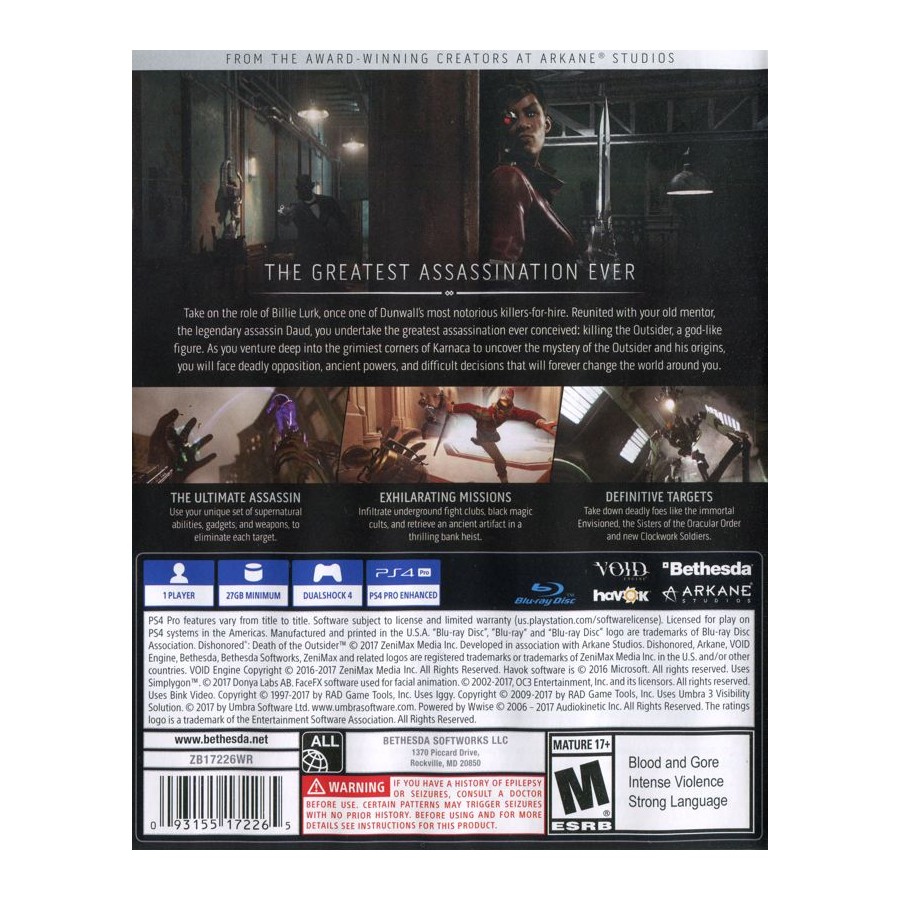 Γίνε μια badass supernatural δολοφόνος, η διαβόητη Billie Lurk, βρες τον παλιό σου δάσκαλο Daud και ενώστε τις δυνάμεις σας για να εξολοθρεύσετε μαζί τον "Outsider". Βασισμένο στο signature gameplay και art style του Dishonored 2, το Death of the Outsider περιλαμβάνει όλα τα hallmarks της σειράς, συμπεριλαμβανομένου του συστήματος μάχης, του μοναδικού level design, και του βαθύ storytelling που ανταποκρίνεται σε κάθε σου επιλογή.