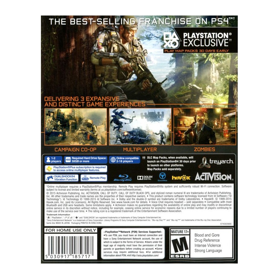 Zombies, Μια νέα ιστορία τρόμου: Κανένας τίτλος της Treyarch δεν θα ήταν πλήρης χωρίς ζόμπι. Το Black Ops 3 Ζombies είναι η πιο συναρπαστική και φιλόδοξη περιπέτεια μέχρι σήμερα, με ένα πλήρες σύστημα εξέλιξης XP, που προσθέτοντας βάθος στην μοναδική και τρομαχτική αυτή περιπέτεια.