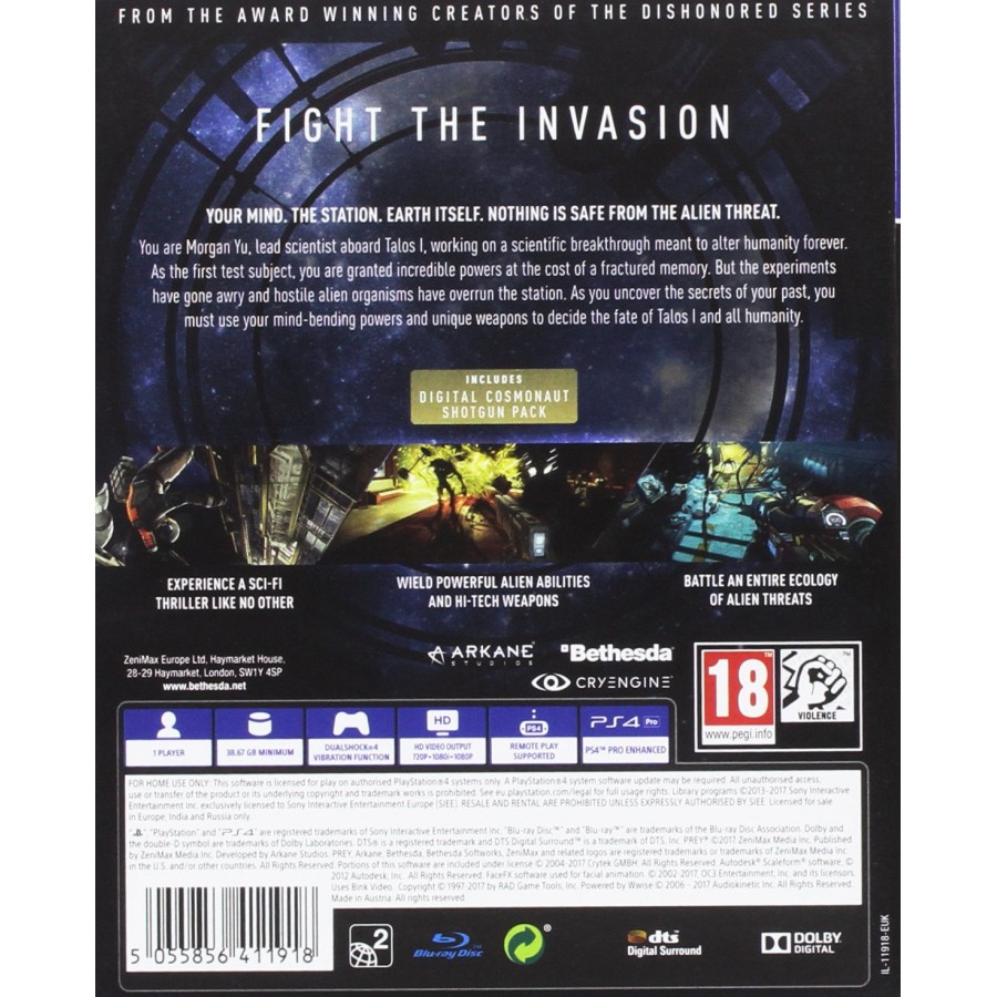 Στο Prey, ξυπνάτε στο Talos I, έναν διαστημικό σταθμό που περιστρέφεται γύρω από το φεγγάρι το έτος 2032. Είστε το βασικό θέμα ενός πειράματος που έχει σκοπό να αλλάξει την ανθρωπότητα για πάντα, αλλά τα πράγματα έχουν πάει τρομερά στραβά. Ο διαστημικός σταθμός έχει κατακλυστεί από εχθρικούς εξωγήινους και τώρα σας κυνηγούν. Καθώς σκάβετε στα σκοτεινά μυστικά του Talos I και του ίδιου σας του παρελθόντος, πρέπει να επιβιώσετε χρησιμοποιώντας τα εργαλεία που βρίσκονται στον σταθμό, τη νοημοσύνη, τα όπλα και τις ικανότητες που σας λύνουν το μυαλό.