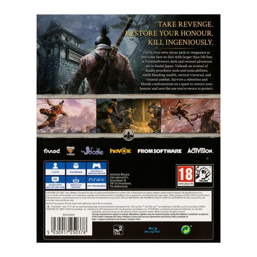 H Activision παρουσιάζει το Sekiro ™: Shadows Die Twice, μια φανταστική, σκοτεινή εμπειρία παιχνιδιού δημιουργούς της σειράς Bloodborne και Dark Souls. Σε σκηνοθεσία: Hidetaka Miyazaki το Sekiro: Shadows Die Twice είναι ένα τρίτου προσώπου παιχνίδι δράσης και περιπέτειας με στοιχεία RPG.
