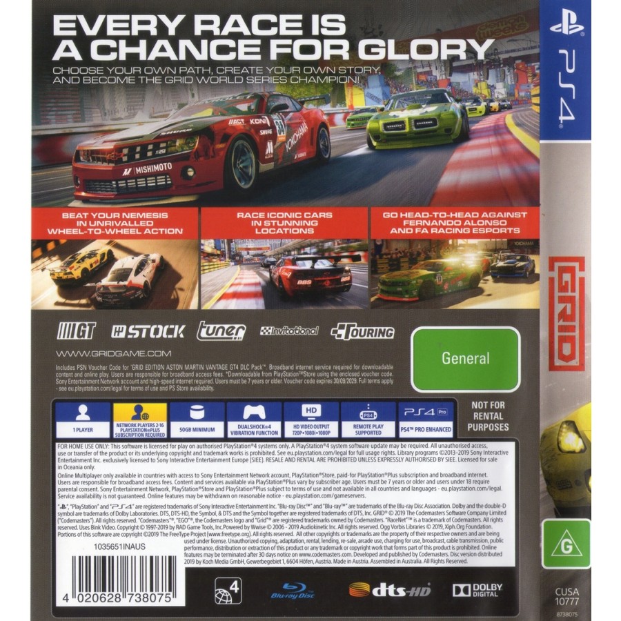 Η Day One Edition περιλαμβάνει: Aston Martin Vantage GT4 Grid Edition Livery Tο GRID, το οποίο αποτυπώνει έντονη δράση αγώνων ταχύτητας, επιστρέφει με μια ολοκαίνουρια εμπειρία όπου κάθε αγώνας είναι ευκαιρία για να επιλέξεις το δικό σου μονοπάτι, να δημιουργήσεις τη δική σου ιστορία και να καθορίσεις την κληρονομιά σου στον κόσμο του μηχανοκίνητου αθλητισμού. Η Codemasters, η εταιρία που δημιούργησε τις άκρως επιτυχημένες σειρές DiRT και F1, σε προσκαλεί να πάρεις θέση στο GRID World Series και να αγωνιστείς ρόδα με ρόδα σε έντονες αναμετρήσεις με τα πιο εμβληματικά και ποθητά αγωνιστικά αυτοκίνητα – τωρινά και κλασσικά, από τα GT και τα Touring, ως τα Muscle, τα Stock και τα Super Modified – και σε μερικούς από τους πιο γνωστούς δρόμους πόλεων, σε κυκλικά στάδια και σε πίστες. Το GRID αναπαριστά κάθε στιγμή του αγώνα, από την έκρηξη αδρεναλίνης όταν σβήνουν τα φώτα μέχρι την ευτυχία της καρό σημαίας – και στο ενδιάμεσο υπάρχει και όλη η δράση. Τα αγωνιστικά συμβάντα διαδέχονται το ένα το άλλο – οριακά προσπεράσματα, αναμετρήσεις ρόδα με ρόδα και αγωνιστικές συγκρούσεις – και όλα αυτά ενισχυμένα από τις αντιπαλότητες μεταξύ αντίπαλων, πιλότων της ίδιας ομάδας κι ενός οδηγού-νέμεσης που είτε προσπαθούν να σε βοηθήσουν, είτε να καθυστερήσουν την πρόοδο σου καθώς προσπαθείς να κατακτήσεις τον στόχο σου και να γίνεις ο επόμενος πρωταθλητής του GRID World Series.