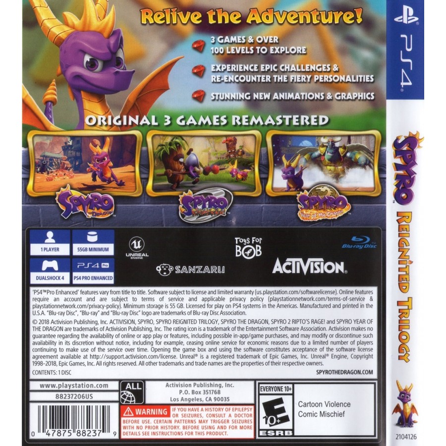 Οι ίδιες απίστευτες σβούρες , η ίδια μοναδική συμπεριφορά του αγαπημένου Spyro τώρα σε μοναδικά HD γραφικά . Ο Spyro επιστρέφει όπως ποτέ άλλοτε στη συλλογή παιχνιδιών Spyro  Reignited Trilogy. Tα 3 μοναδικά αρχικά παιχνίδια Spyro the Dragon, Spyro 2: Rage's Rage! και Spyro : year of the dragon σε μια μοναδική συλλογή. Εξερευνήστε τις σφαίρες, συναντήστε ξανά αγαπημένους ήρωες και ξαναζήστε τις περιπέτειες με νέα μοναδικά γραφικά. Γιατί όταν υπάρχει μια σφαίρα που χρειάζεται εξερεύνηση, υπάρχει μόνο ένας δράκος για να καλέσετε.