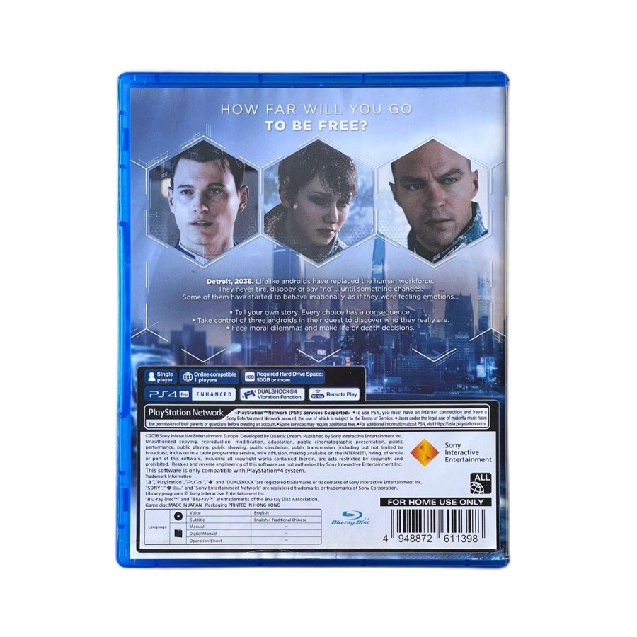 Το Detroit: Become Human είναι το νέο πόνημα της δημοφιλούς Quantic Dream (Heavy Rain, Beyond: Two Souls). Στο Detroit του όχι και τόσο μακρινού μέλλοντος, τα ανδροειδή ζουν παράλληλα με τους ανθρώπους, διατηρώντας μια εύθραυστη σχέση. Χειρίσου την Kara, ένα ανδροειδές που ξέφυγε από τα προγραμματισμένα όριά της και προσπαθεί να επιβιώσει στον σκληρό, άνισο από άποψης δικαιωμάτων και ελευθερίας, κόσμο. Στον χειρισμό σου επίσης θα βρεθεί κι ο Connor, ένας ειδικός αστυνομικός ερευνητής που αναλαμβάνει υποθέσεις που αφορούν deviants, δηλαδή ανδροειδή που έχουν ξεφύγει από τα όσα είχαν προγραμματιστεί να κάνουν, κι έχουν απαρνηθεί τους ιδιοκτήτες και τα καθήκοντά τους. Τέλος, ο Markus είναι ο επαναστάτης που ξέφυγε από τον αφέντη του και θέλει να φέρει την αλλαγή για τα ανδροειδή -- με ειρηνικό ή βίαιο τρόπο.