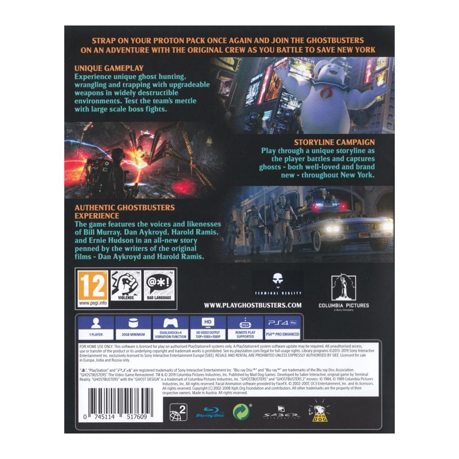• Η αυθεντική εμπειρία Ghostbusters – Το παιχνίδι προσφέρει τις φωνές και το παρουσιαστικό του Bill Murray, του Dan Aykroyd, του Harold Ramis και του Ernie Hudson, σε ένα πρωτότυπο σενάριο που έγραψαν οι σεναριογράφοι των ταινιών, Dan Aykroyd και Harold Ramis.