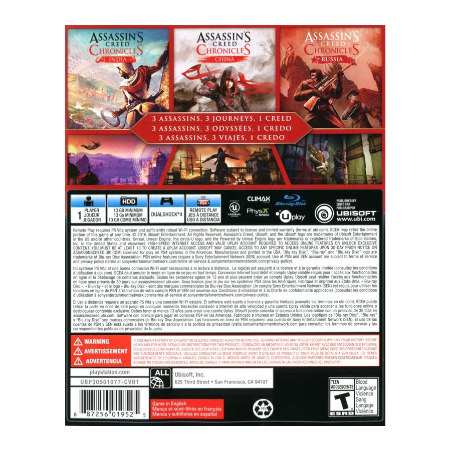 Το Assassin's Creed Chronicles σας περνάει από τρεις διαφορετικούς πολιτισμούς και ιστορικές περιόδους όπως τη δυναστεία Μινγκ στην αρχή της παρακμής της, την αυτοκρατορία των Σιχ καθώς ετοιμάζεται για πόλεμο στην Ινδία και στην Ρωσία μετά την επανάσταση του κόκκινου Οκτώβρη.