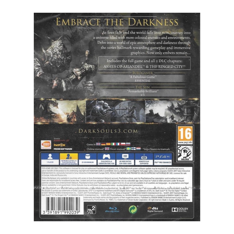 Μια αδυσώπητη και προκλητική εμπειρία παιχνιδιού ρόλων περιμένει όσους έχουν τα κότσια. Καθώς οι φωτιές σβήνουν κι ο κόσμος καταρρέει, ταξιδέψτε σε ένα σύμπαν γεμάτο κολοσσιαίους εχθρούς και επικίνδυνα περιβάλλοντα. Βυθιστείτε σε έναν κόσμο γεμάτο σκοτάδι. Οι νέοι θαυμαστές του Dark Souls θα χαθούν στα συναρπαστικά γραφικά του. Προετοιμαστείτε για άλλη μια φορά να αγκαλιάσετε το σκοτάδι.