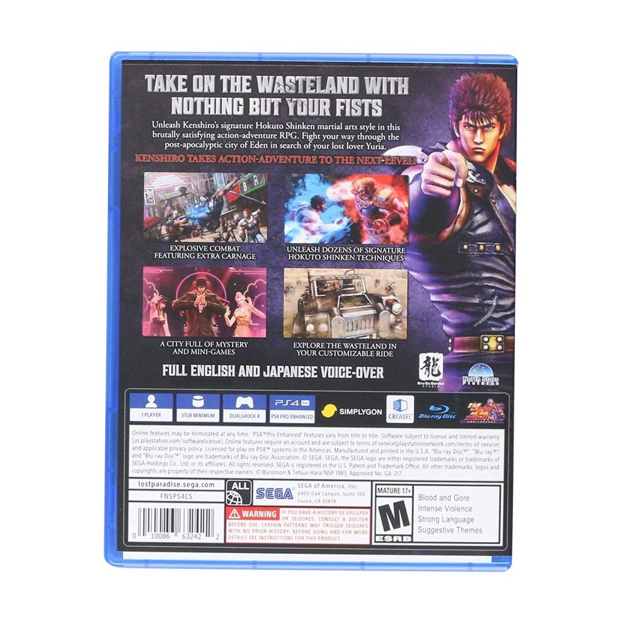 Το Fist of the North Star: Lost Paradise είναι ένα ολοκαίνουργιο κεφάλαιο στο έπος Hokuto Shinken saga! Ως κύριος του στυλ πολεμικών τεχνών Hokuto Shinken, ο Kenshiro θα καταστρέψει τους εχθρούς από μέσα προς τα έξω με δεκάδες βάναυσες και εμβληματικές τεχνικές, όλες πιστά αναδημιουργημένες από το αρχικό manga. Πέρα από τις μάχες, ο Kenshiro μπορεί να εμπλακεί με τους πολίτες της Εδέμ και να φτάσει τις δεξιότητές του ως δάσκαλος του Hokuto Shinken με νέα κατορθώματα όπως το bartending, οι αγώνες buggy στις ερημιές και πολλά άλλα!