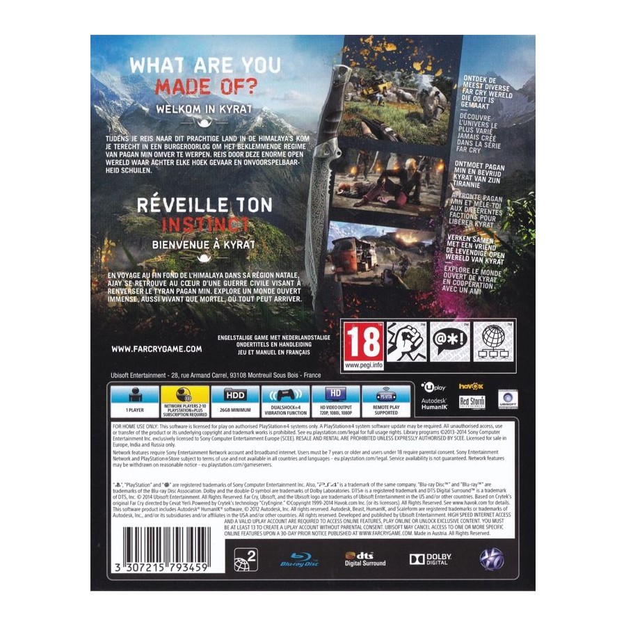 Κρυμμένο στα πανύψηλα Ιμαλάια βρίσκεται το Kyrat, μια χώρα πλούσια σε παράδοση και βία. Είσαι ο Ajay Ghale. Ταξιδεύοντας στο Kyrat για να εκπληρώσεις την τελευταία επιθυμία της μητέρας σου, βρίσκεις τον εαυτό σου παγιδευμένο σε έναν εμφύλιο πόλεμο για την ανατροπή του καταπιεστικού καθεστώτος του δικτάτορα Pagan Min. Περιηγήσου και εξερεύνησε αυτόν τον τεράστιο ανοικτό κόσμο, όπου ο κίνδυνος και οι εκπλήξεις παραμονεύουν σε κάθε γωνιά. Εδώ, κάθε απόφαση μετράει.