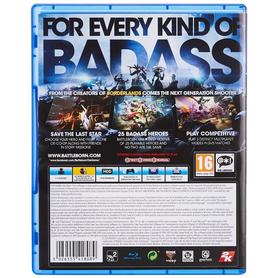 Το σύμπαν βρίσκεται στο χείλος της καταστροφής και μόνο οι πιο δυνατοί Battleborn μπορούν να το σώσουν. Αυτή η ομάδα ηρώων θα πολεμήσει με σπαθιά, θα ρίξει με τεράστια όπλα, θα εξαπολύσει ξόρκια και πολλά άλλα! Παίξτε με 25 μοναδικούς ήρωες. Πολεμήστε μόνος ή παρέα με τους φίλους σας. Παίξτε αποστολές με ιστορία ή κατατροπώστε εχθρούς σε συναγωνιστικές μάχες multiplayer.