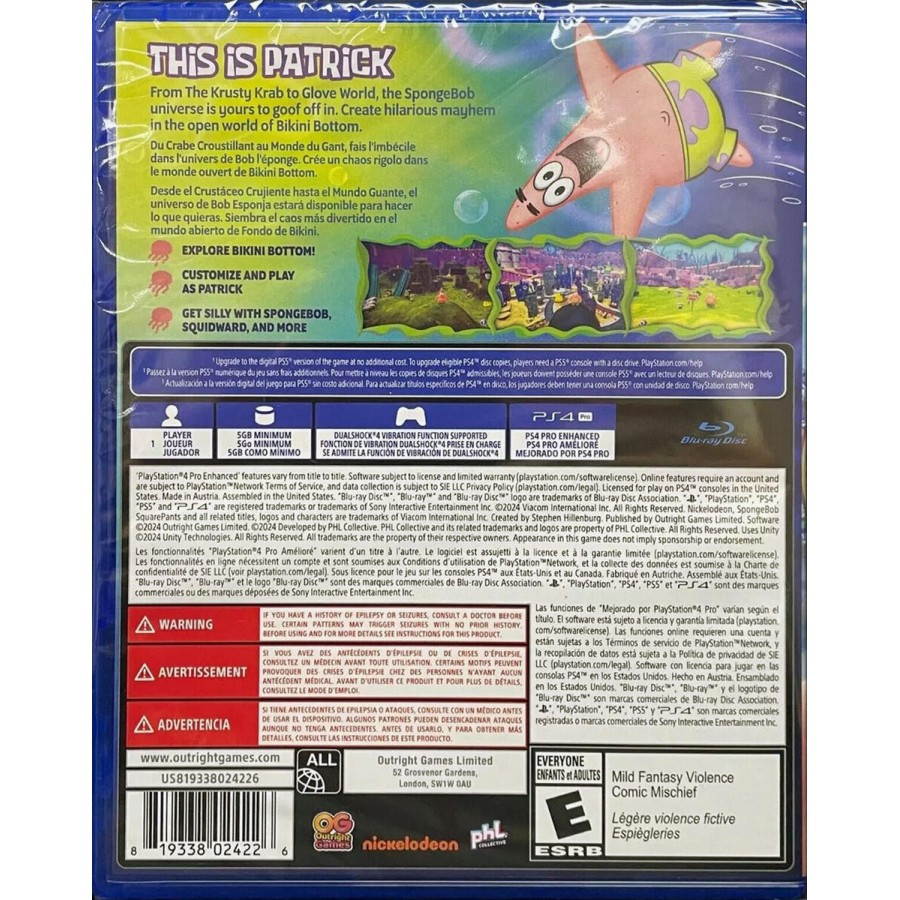Το "The Patrick Star Game" για το PS4 είναι ένα διασκεδαστικό και χιουμοριστικό παιχνίδι πλατφόρμας που πρωταγωνιστεί τον Patrick Star, τον αγαπημένο χαρακτήρα από την τηλεοπτική σειρά "SpongeBob SquarePants". Οι παίκτες θα έχουν την ευκαιρία να εξερευνήσουν πολύχρωμα και πρωτότυπα επίπεδα, αντιμετωπίζοντας διάφορες προκλήσεις και εχθρούς. Το παιχνίδι περιλαμβάνει διάφορα μίνι παιχνίδια, γρίφους και αποστολές που αναδεικνύουν το μοναδικό χιούμορ του Patrick και τον ιδιαίτερο χαρακτήρα του. Είναι ιδανικό για οικογένειες και θαυμαστές της σειράς που αναζητούν μια ευχάριστη και χαλαρωτική εμπειρία gaming.