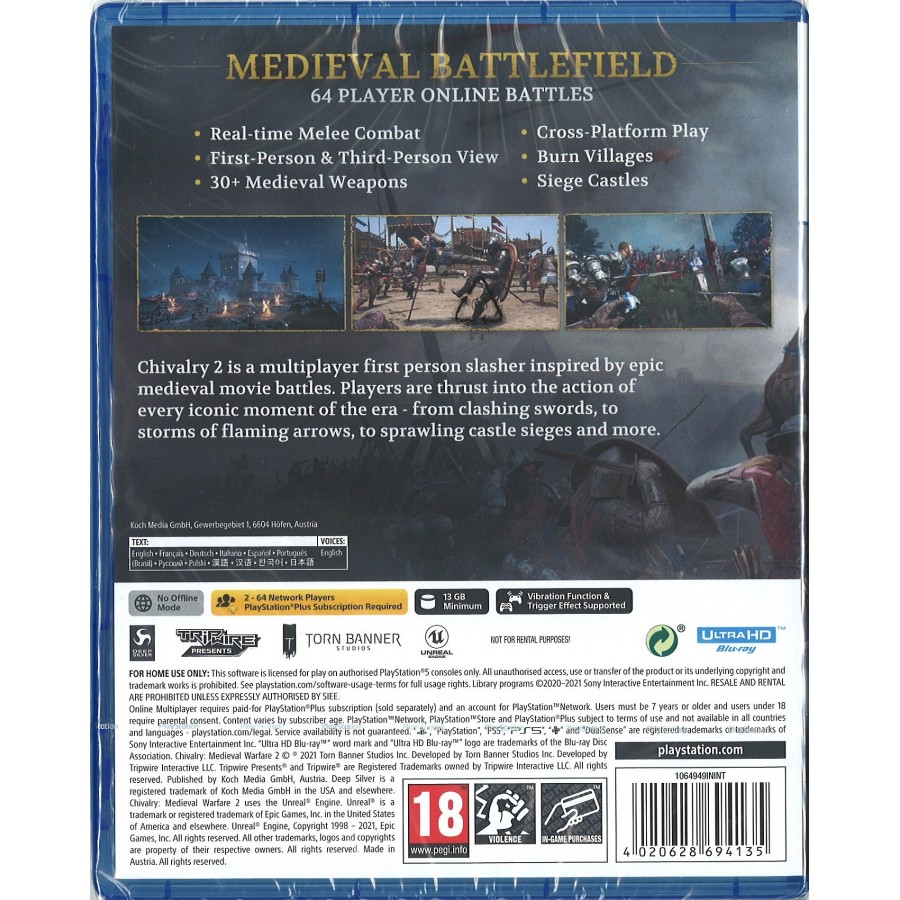 Το Chivalry II είναι ένα multiplayer first-person slasher εμπνευσμένο από τις επικές ταινίες μεσαιωνικών μαχών. Οι παίκτες ορμούν στη δράση σε κάθε εμβληματική στιγμή της περιόδου – με το σπαθί στο χέρι, δεχόμενοι μια θύελλα φλεγόμενων βελών, μπροστά σε κάστρα που πολιορκούνται.