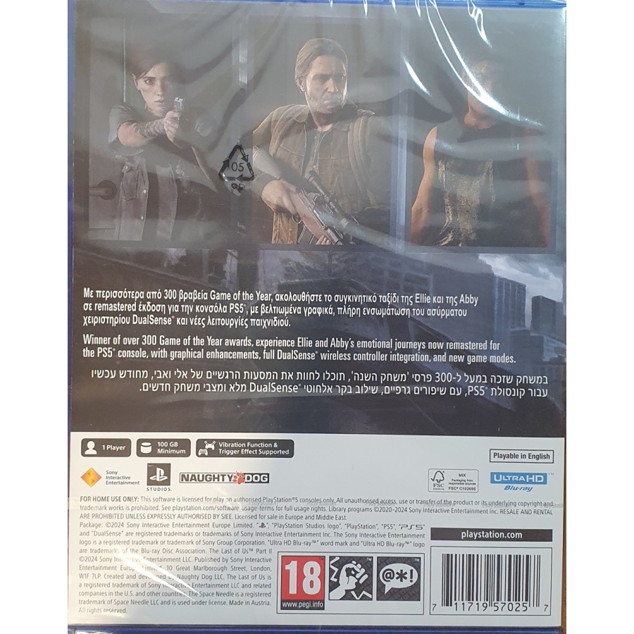Παίξε το παιχνίδι που κέρδισε πάνω από 300 βραβεία Game of the Year, remastered για την κονσόλα PlayStation 5. Ξαναζήσε ή παίξε για πρώτη φορά την ιστορία της Ellie και της Abby, τώρα με βελτιωμένα γραφικά, νέους τρόπους παιχνιδιού, όπως η εμπειρία επιβίωσης roguelike No Return, πλήρη ενσωμάτωση του ασύρματου χειριστηρίου DualSense και πολλά άλλα. Πέντε χρόνια μετά το επικίνδυνο ταξίδι τους στις μεταπανδημικές Ηνωμένες Πολιτείες, η Ellie και ο Joel έχουν εγκατασταθεί στο Jackson του Wyoming. Η διαβίωση ανάμεσα σε μια ακμάζουσα κοινότητα επιζώντων τους έχει επιτρέψει την ηρεμία και τη σταθερότητα, παρά τη συνεχή απειλή των μολυσμένων και άλλων, πιο απελπισμένων επιζώντων. Όταν ένα βίαιο γεγονός διαταράσσει αυτή την ηρεμία, η Ellie ξεκινά ένα ταξίδι για να αποδώσει δικαιοσύνη και να δώσει ένα τέλος.