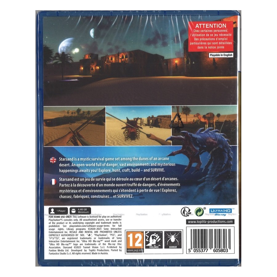 Το Starsand είναι ένα παιχνίδι επιβίωσης στην έρημο που θα σε μεταφέρει σε έναν ανοιχτό κόσμο που μοιάζει με τη Γη αλλά έχει πολύ διαφορετική αίσθηση. Κίνδυνοι, μυστήρια και γρίφοι σε περιμένουν! Μάθε τι ακριβώς συνέβη, πού βρίσκεσαι και τι σε συνδέει με την ιστορία ενός εξαφανισμένου πολιτισμού. Θα καταφέρεις να επιβιώσεις στο αφιλόξενο περιβάλλον, να βρεις απαντήσεις και να βρεις τον δρόμο της επιστροφής στην παλιά σου ζωή;