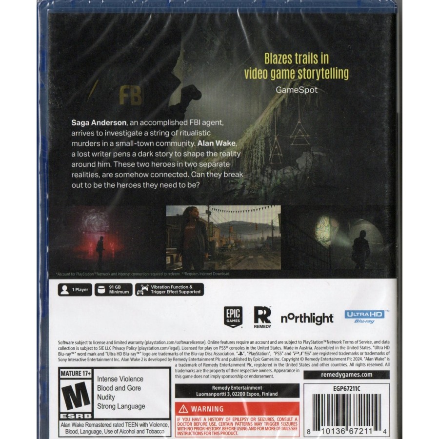 Το Alan Wake 2 σηματοδοτεί την πρώτη προσπάθεια της Remedy Entertainment στο είδος του παιχνιδιού survival horror. Τελετουργικοί φόνοι σε μία μικρή πόλη. Ένας συγγραφέας παγιδευμένος σε έναν εφιάλτη. Ένας πράκτορας του FBI που ψάχνει για απαντήσεις. Δύο πραγματικότητες. Δύο ήρωες. Ένας ιστορία τρόμου που τους θέλει νεκρούς.