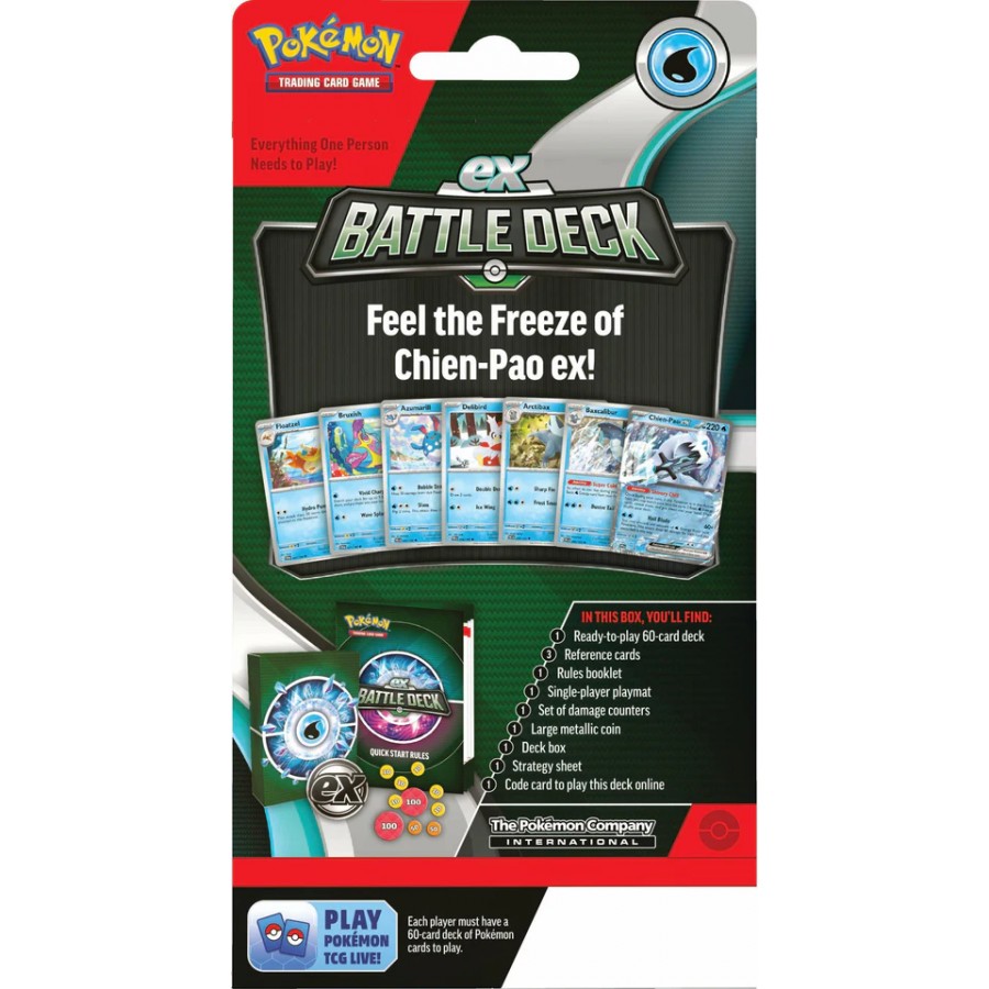 Κάθε July ex Battle Deck Display (6ct) περιλαμβάνει: 60-card deck, Quick start rules, Playmat, Damage counter sheet, Strategy Sheet, Coin, PCD reference cards, Keeper box, Codecard