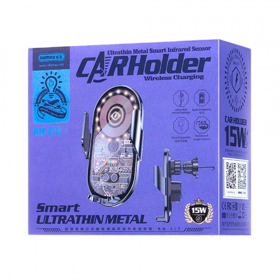 Βάση κινητού αυτοκινήτου RM-C17 της εταιρείας Remax. Πρόκειται για τον πιο διαδεδομένο τύπο βάσης καθώς στηρίζεται στον αεραγωγό του κλιματισμού ή του καλοριφέρ αυτοκινήτου. Η στήριξη της συσκεύης στη βάση γίνεται με ρυθμιζόμενα άγκιστρα. Διαθέτει ασύρματη φόρτιση έτσι ώστε να φορτίζει η συσκευή σας κάθε φορά που την τοποθετείτε στην βάση. Πρέπει να σημειωθεί ότι για να φορτίσει ασύρματα η συσκευή θα πρέπει και η ίδια να έχει δυνατότητα ασύρματης φόρτισης.