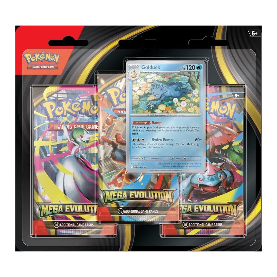 Striving to become stronger, Pokémon of all types are putting everything on the line to become Mega Evolution Pokémon ex! Harness the strong aura of Mega Lucario ex, embrace the overflowing power of Mega Gardevoir ex, and team up with more of these powerful Pokémon that boast devastating attacks and massive HP. But consider your strategy carefully—extra power brings extra risks! Choose your Pokémon partners and prepare for the biggest battles you’ve ever seen in the Pokémon TCG: Mega Evolution expansion! This set includes a special foil promo card featuring one of Psyduck or Golduck! You will also find 3 Pokémon TCG: Mega Evolution booster packs.