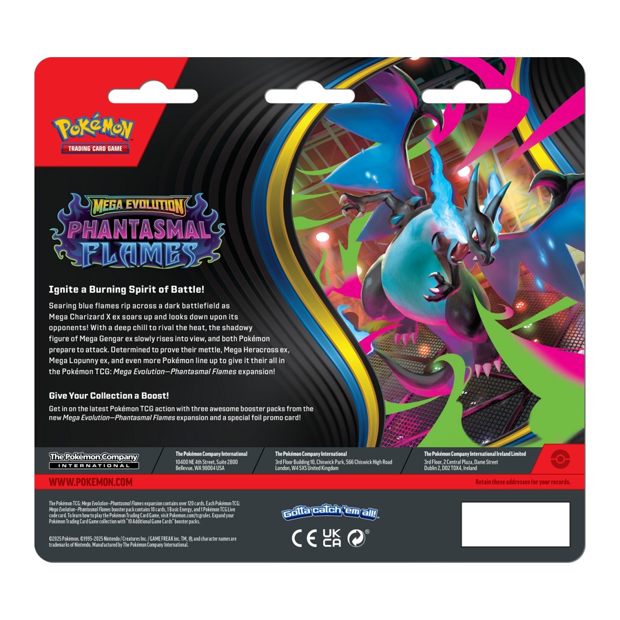 Καυτές μπλε φλόγες σκορπίζουν ένα σκοτεινό πεδίο μάχης καθώς ο Mega Charizard X ex πετάει ψηλά και κοιτάζει τους αντιπάλους του! Με ένα βαθύ ρίγος να ανταγωνίζεται τη ζέστη, η σκιώδης φιγούρα του Mega Gengar ex αναδύεται αργά στο προσκήνιο και τα δύο Pokémon ετοιμάζονται να επιτεθούν. Αποφασισμένοι να αποδείξουν το σθένος τους, ο Mega Heracross ex, ο Mega Lopunny ex και ακόμη περισσότερα Pokémon παρατάσσονται για να τα δώσουν όλα στην επέκταση Pokémon TCG: Mega Evolution—Phantasmal Flames!