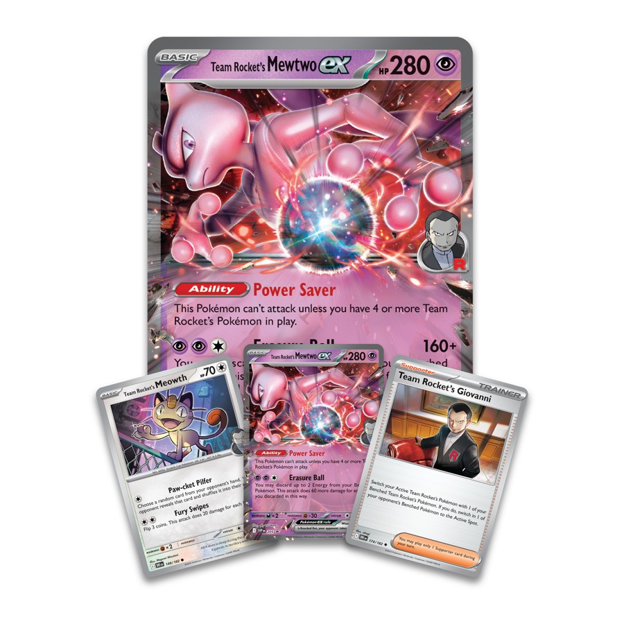 The Pokémon TCG: Team Rocket’s Mewtwo ex Box includes: