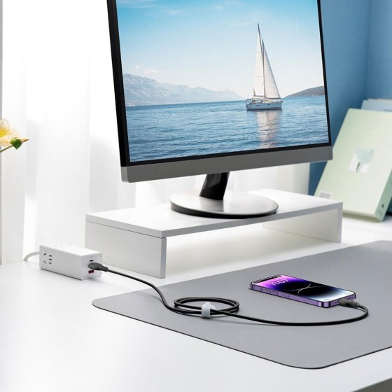 Lightning καλώδιο της εταιρίας Baseus που συνδέει την Apple συσκευή με υποδοχή Lightning στη θύρα USB του υπολογιστή ή του φορτιστή για συγχρονισμό και φόρτιση.