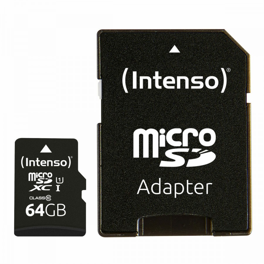 microSDXC κάρτα μνήμης της εταιρίας Intenso. Διαθέτει χωρητικότητα 64GB. Το μέγεθος αυτό είναι ικανό να υποστηρίξει την αποθήκευση μεγάλου όγκου φωτογραφιών υπερυψηλής ανάλυσης, μικρό αριθμό παιχνιδιών (αν προορίζεται για κονσόλα), πολύωρη καταγραφή σε action cams, drones κ.α. Πρόκειται για SD κάρτα με Speed Class 10 προσφέροντας ελάχιστη ταχύτητα εγγραφής 10MB/s. Διαθέτει Bus Speed UHS-I με μέγιστη δυνατή ταχύτητα εγγραφής τα 104MB/s. Το χαρακτηριστικό του UHS Speed Class αντιστοιχεί σε U1 και εγγυάται ελάχιστο ρυθμό εγγραφής 10MB/s. Επιλέγεται συνήθως για λήψη και αποθήκευση Video ανάλυσης έως και Full HD στα 60fps όπως επίσης για λήψη φωτογραφιών σε RAW Format.